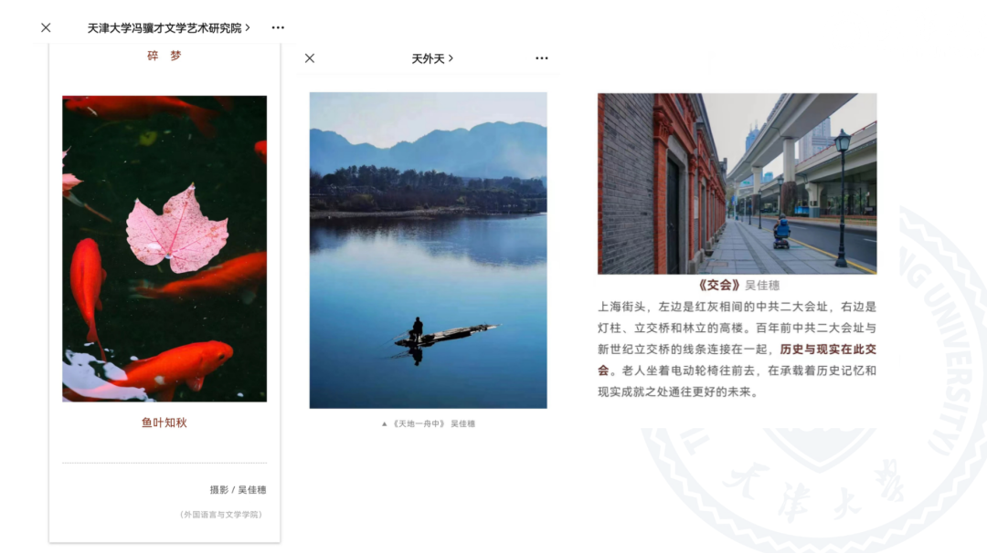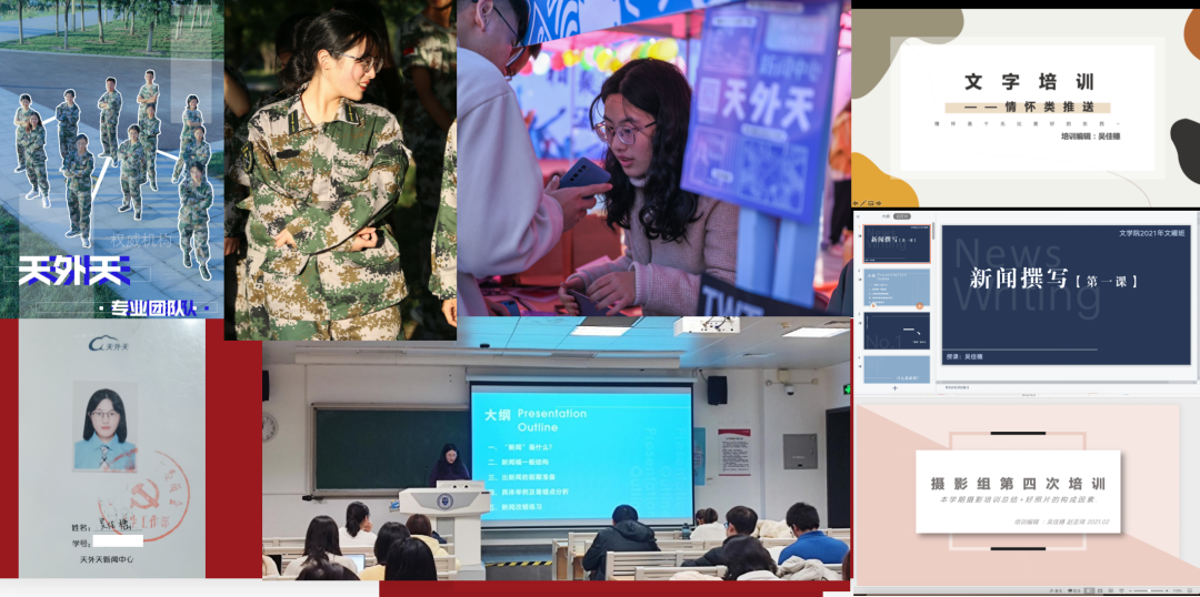 “学生记者”“校园媒体人”的标签背后是她对新闻宣传工作炽热的爱。她在“天大外文团委”“天外天”等微信公众号、天外天新闻网、《韩国h漫 报》等多个校园媒体平台上发布新闻、推送六十余篇,审核新闻、推送数十篇,也曾为“天大社研会”“天大学生会”等公众号和韩国h漫 新闻网供图,为讲好天大故事不懈努力。