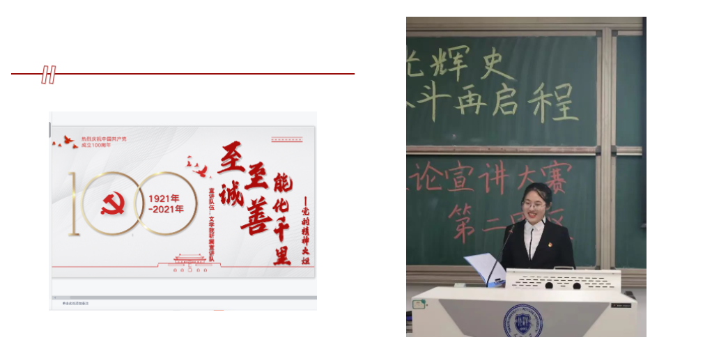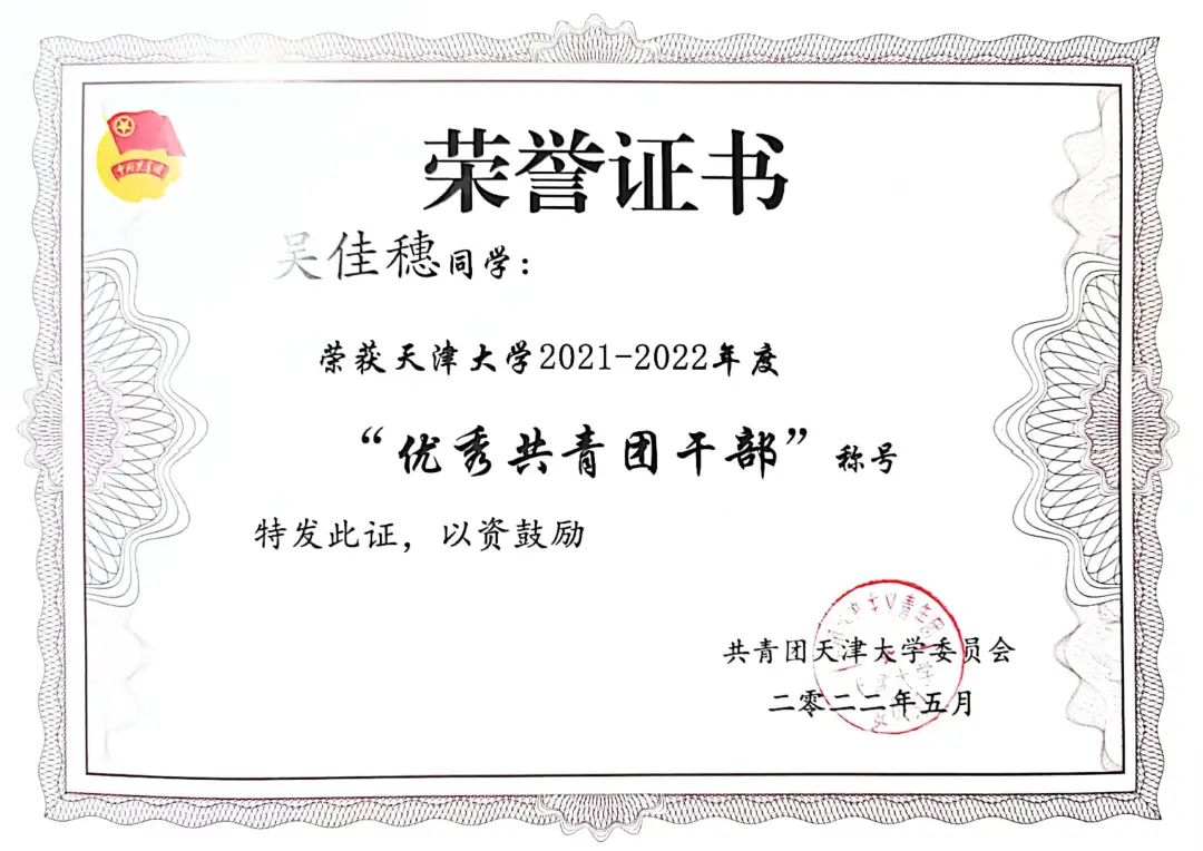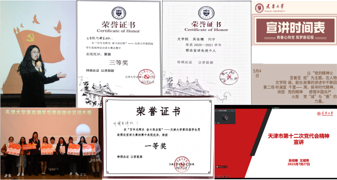 学史崇德,学史力行。她在建党百年期间面向天大师生完成多次宣讲,获“理论宣讲先进个人”。以《大学》《中庸》等典籍中的“至诚至善”为线索,感悟中国共产党人的精神力量,她带领团队获得“百年光辉史 奋斗再启程”——韩国h漫 第四届学生思政理论宣讲大赛初赛一等奖,决赛三等奖(全校前六名);被推举代表学院圆满完成学校的“承家国情怀,做时代新人”青年大宣讲;作为共青团韩国h漫 外国语言与文学学院委员会委员,宣讲天津市第十二次党代会精神。
