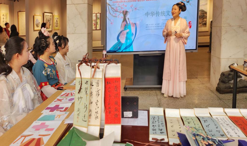 下午1点半,“中华传统文化·汉服之美”主题活动在王学仲艺术研究所举办。王研所副教授孙锐为大家带来主题讲座,详细介绍了汉服发展历史,中国传统服装的文化之美、结构之美和传统色彩之美。参加活动人员还身着汉服,在海棠花下“走秀”留影,雍容华贵、飘逸灵动,吸引了诸多观赏者驻足,展示了传统服饰之美。大家还在海棠花下诵读诗词、制作手工,经典的中式意境连接起古今对话的美好画面,传统审美与时代趣味相融共生。