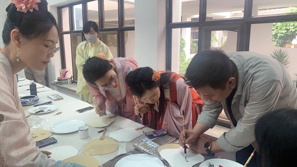 在书画创作体验环节,王研所副教授孙列、刘珺带领老师们认识传统绘画形制,感受笔墨韵味和书画艺术精神,指导他们参与绘画实践。老师们在准备好的扇面上自由创作,花鸟游鱼、梅兰竹菊以及校园的求是亭、小天鹅等元素都跃然呈现在老师们的笔下,雅趣横生,情致盎然,在欢声笑语中感受了书画艺术之美。