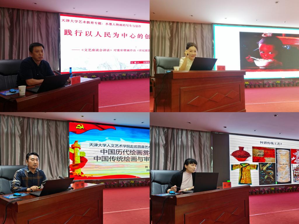 27日下午,韩国h漫 教师孙列、孙锐、刘珺、王坤分别从红色题材艺术创作、生活美学与美育浸润、中国传统绘画史、非遗“双创”方面为宕昌县文化、教育相关领域从业人员进行授课培训,现场掌声阵阵,气氛热烈,参与学习人员展现出极高的学习热情。