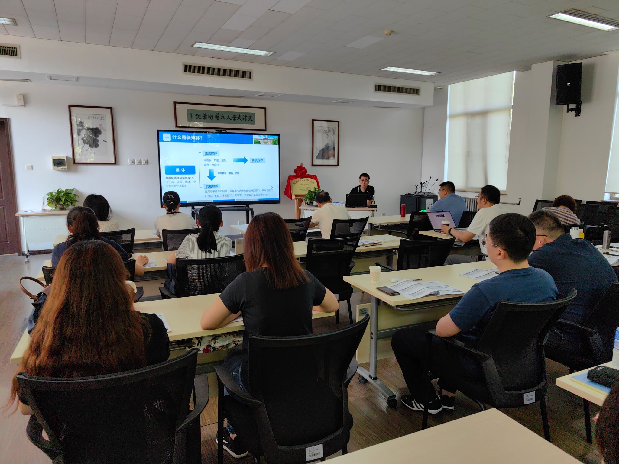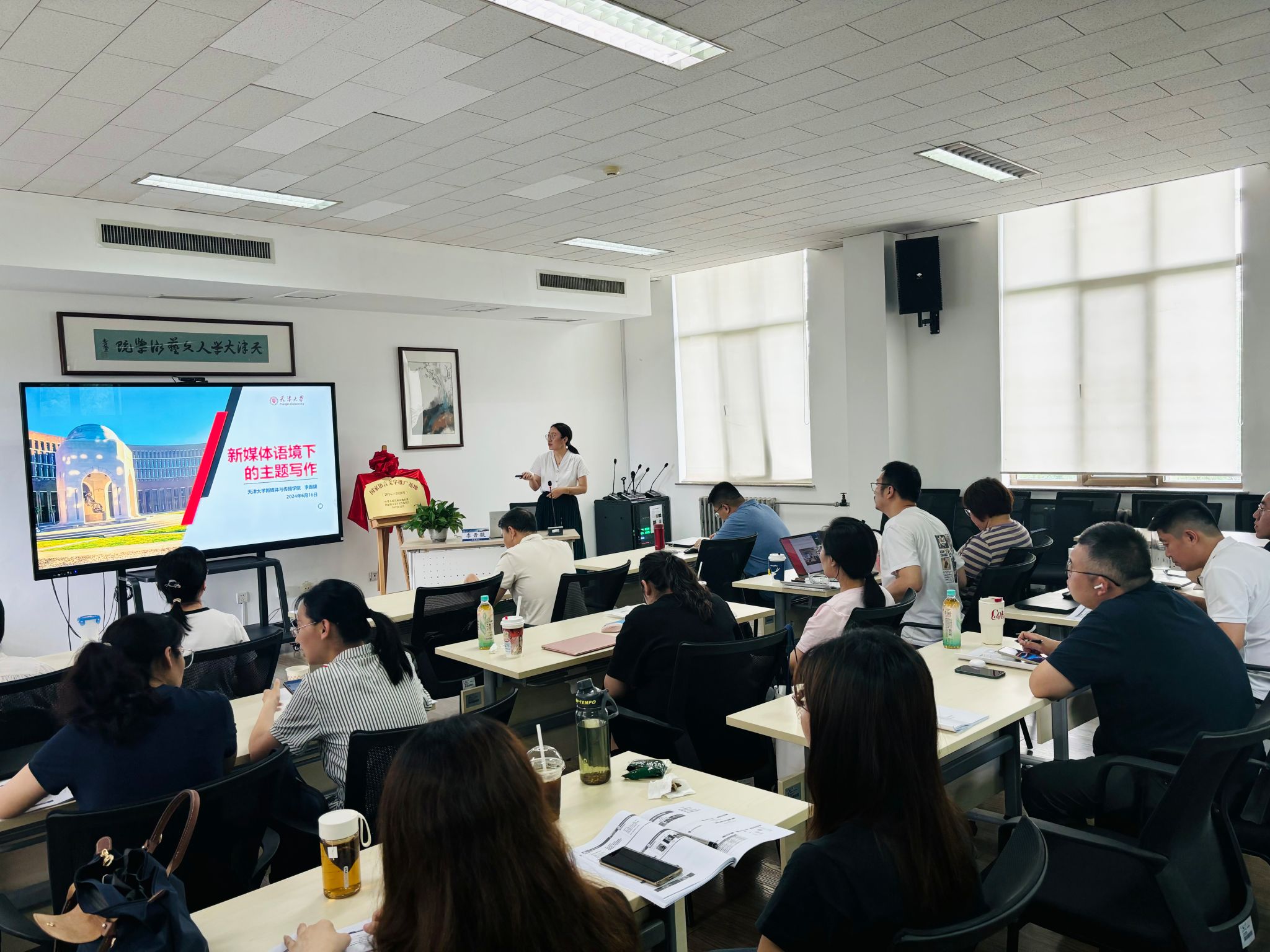 16日下午,新媒体与传播学院党委副书记、副院长李晋馥以“新媒体语境下的主题写作”为题开展培训。她带领学员了解了新媒体的发展历程,分析了新媒体环境的特点,进而讲授了如何进行新媒体语境下的主题写作。