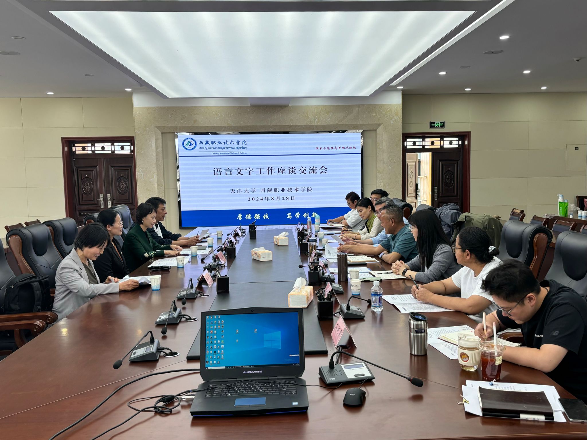 与会人员就中华经典诵读工程、国家普通话水平测试、少数民族地区电商从业人员语言文字培训及拉萨市臧服饰(传统服饰)调研项目工作情况进行交流对接,就有关项目的合作方向进行研究讨论。