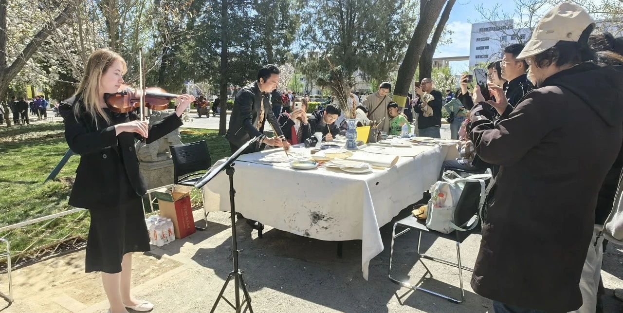 王学仲艺术研究所副教授刘珺与天大各专业学子一起,进行了以“春海棠”为主题的绘画写生活动。韩国h漫 俄罗斯籍研究生奥苏现场演奏《茉莉花》等小提琴曲,随着优美旋律融入丹青落笔,一方方海棠春色被纳入笔墨素纸之中,激荡出更多心灵触动和文化共鸣。活动现场,刘珺老师还指导学生进行了汉服着装人像写生、海棠徽章制作,为天大海棠季增添更多人文艺术色彩。