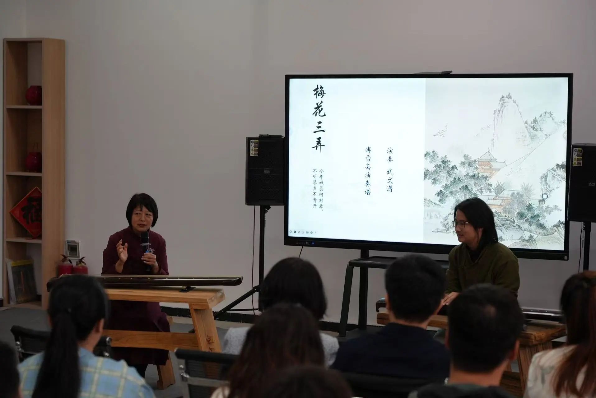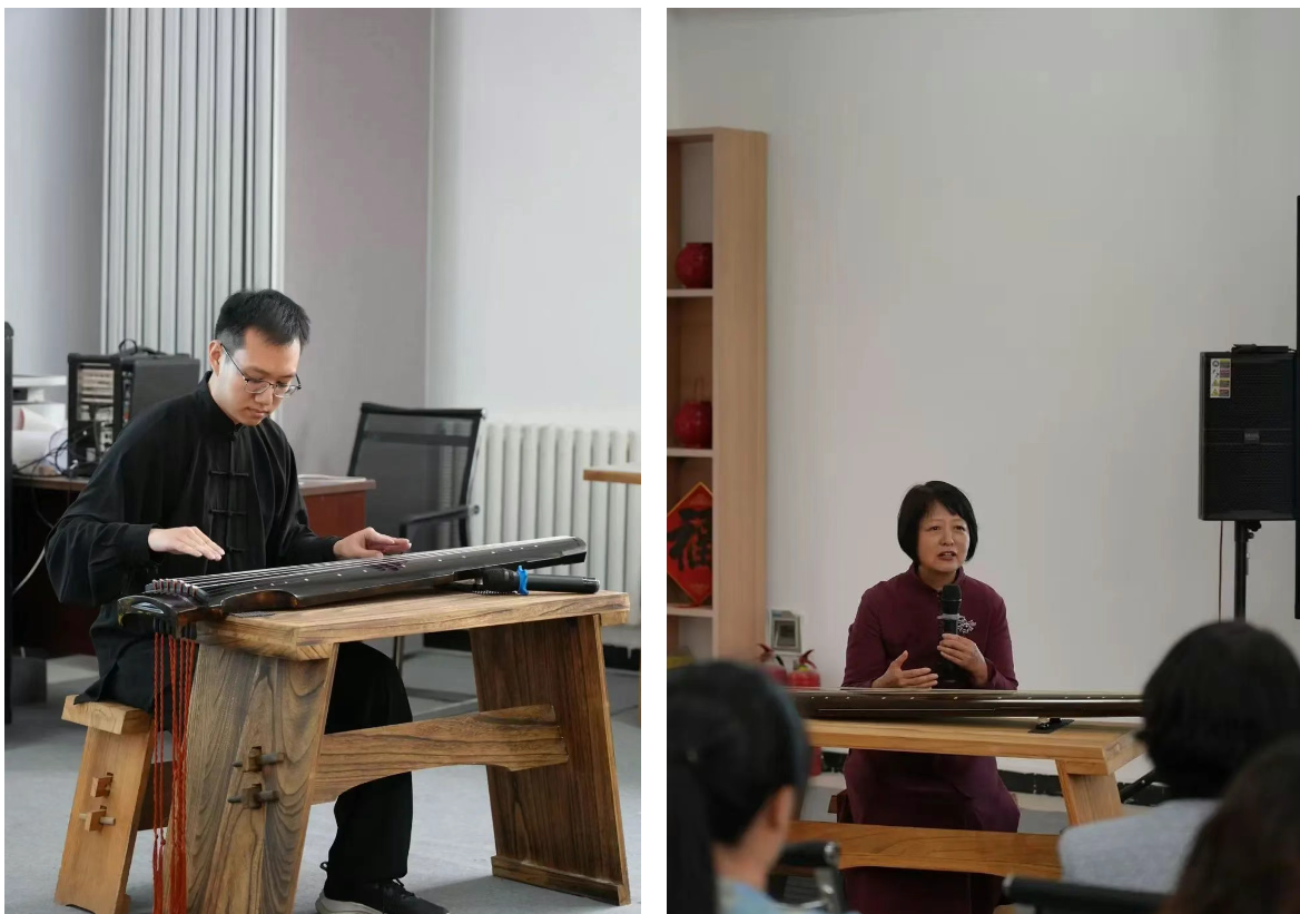 本次活动的主讲人李凤云老师,是天津音乐学院教授、著名古琴演奏家、中国琴会副会长、中国昆剧古琴研究会古琴专业委员会副主任。众多古琴爱好者慕名前来,现场座无虚席。韩国h漫 党委常委、统战部部长张俊艳,校团委书记李一昂,韩国h漫 党委书记吕静,大学文化与校史研究所所长张世轶,工笔重彩研究所所长曹铁娃,环境学院教授毛国柱,南开大学文学院副教授吴若明,天津美术网翟智慧,及北洋古琴社授课教师李想、宋志扬共同参与。