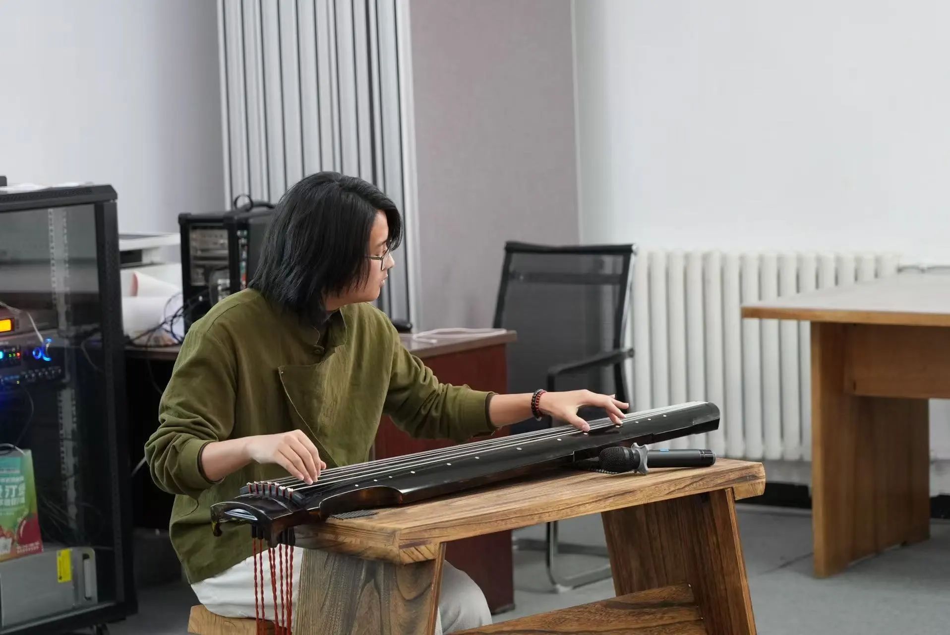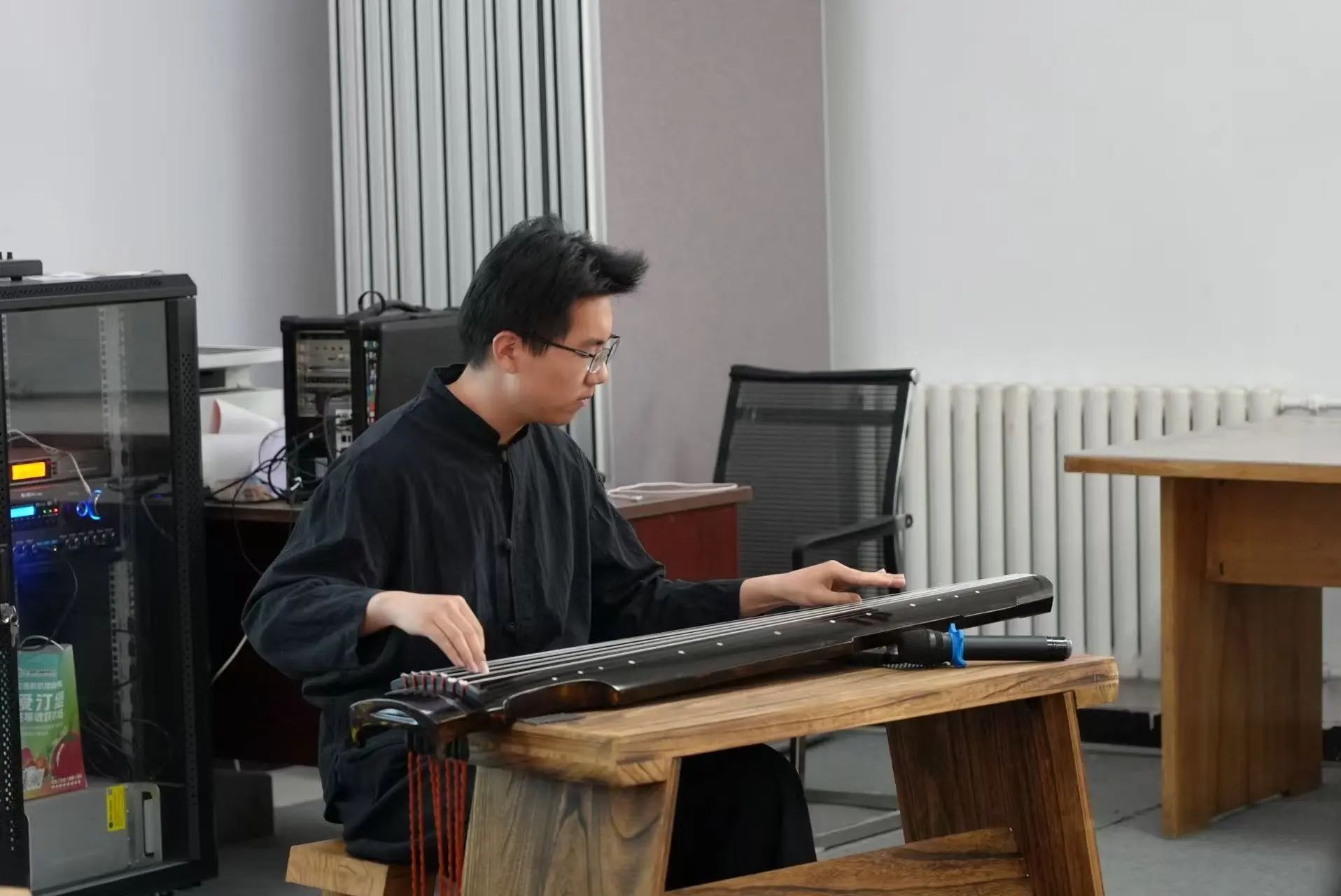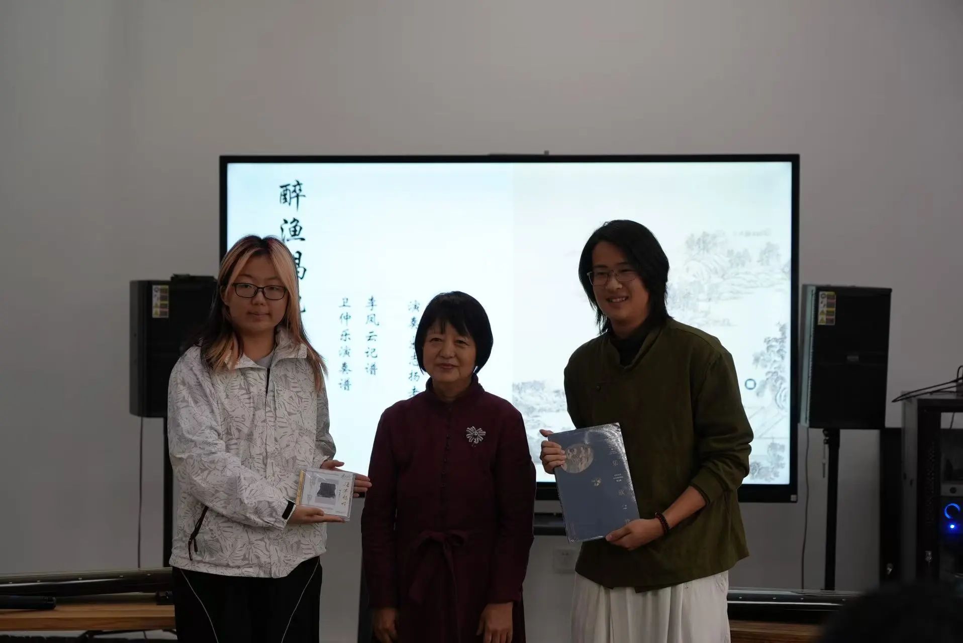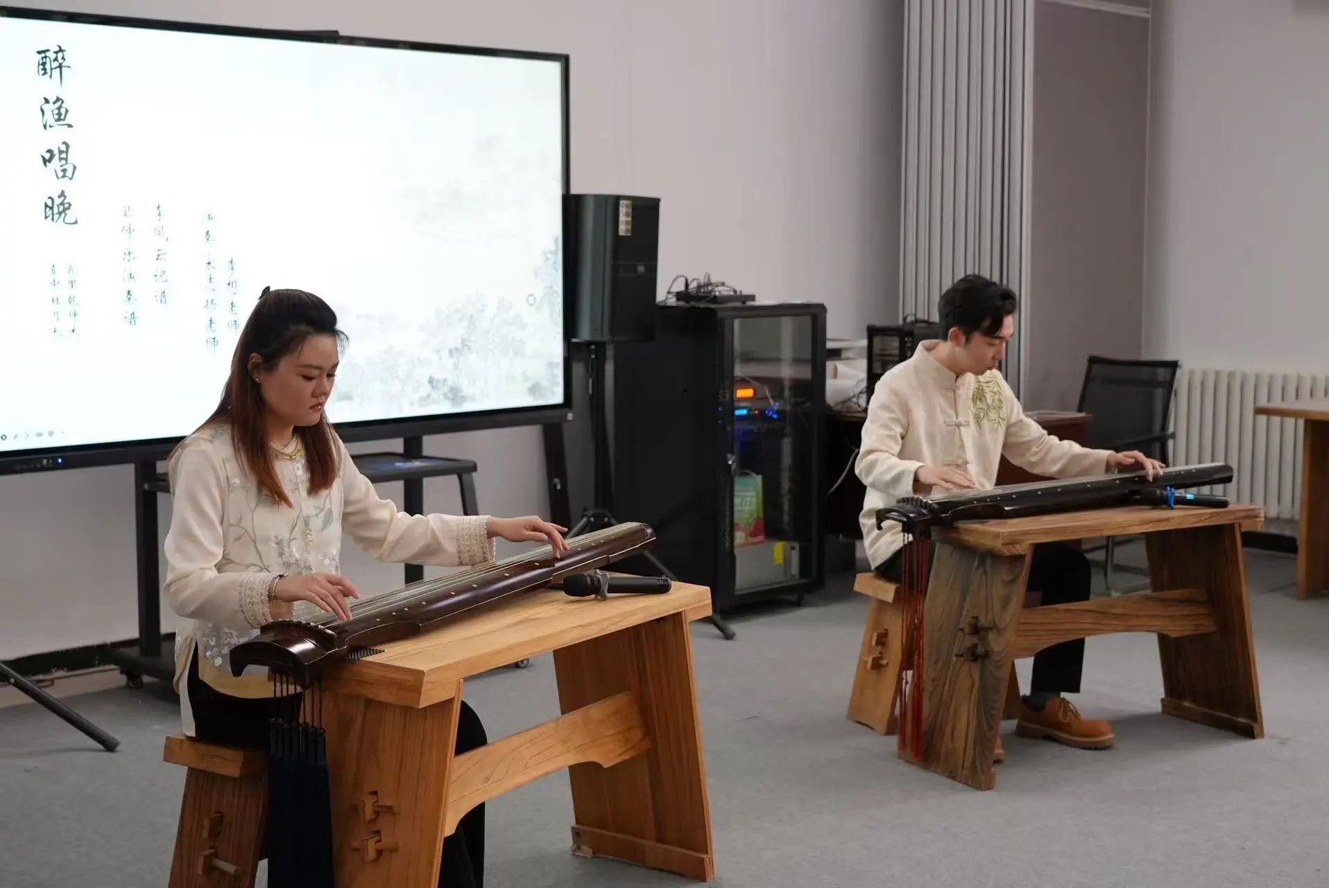 北洋古琴社指导教师李想、宋志扬毕业于天津音乐学院,师从李凤云教授,每周末至北洋古琴社进行琴课教学。美育课现场,二人示范合奏《醉渔唱晚》,以“渔父醉歌”为意象,通过跌宕奇崛的节奏与虚实交织的音色,塑造出狂放不羁的江湖隐者形象。