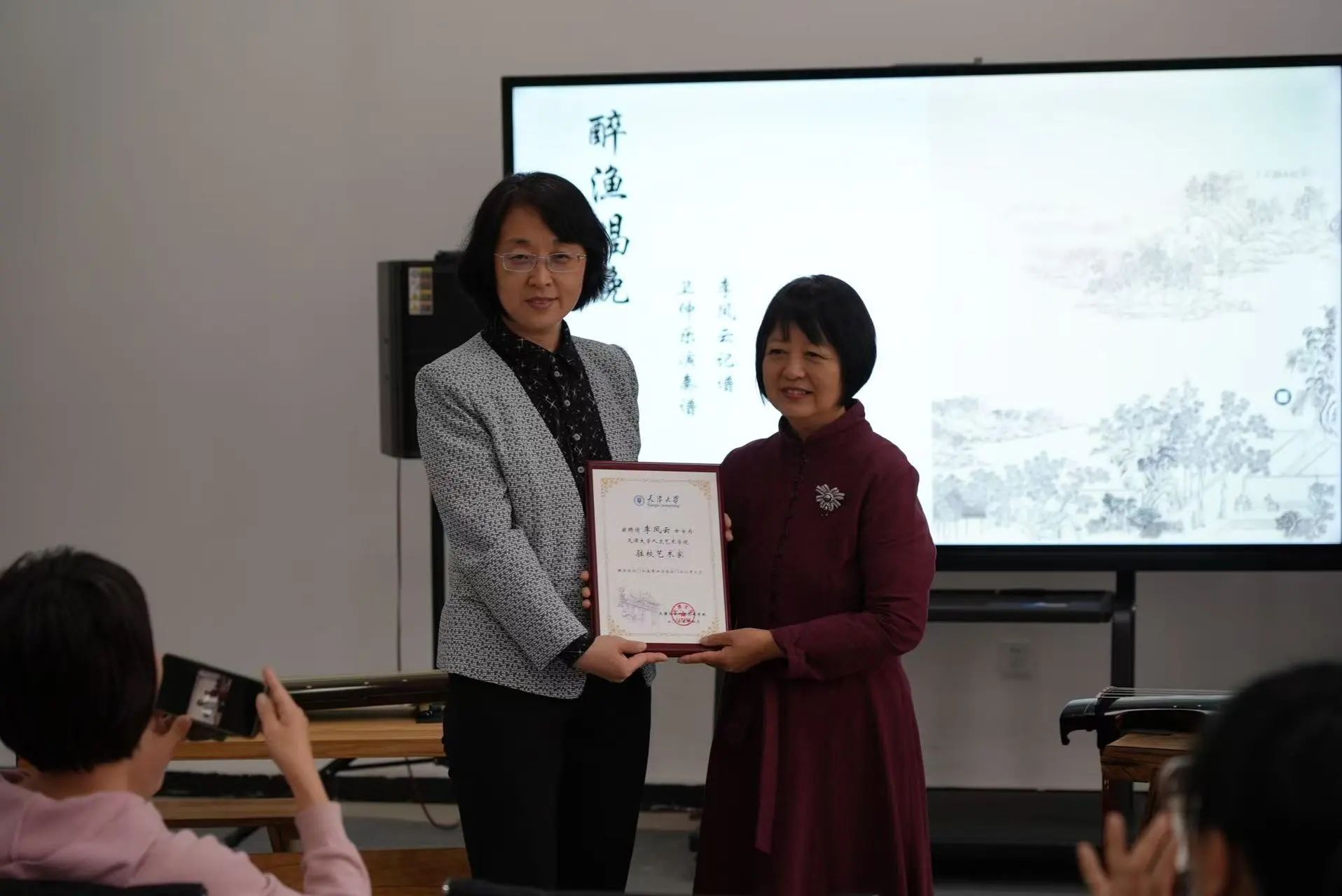 韩国h漫 党委常委、统战部部长张俊艳为李凤云教授颁发“驻校艺术家”聘书。李凤云教授回赠北洋古琴社《沧海龙吟》古琴曲录音片和一本乐谱收藏。