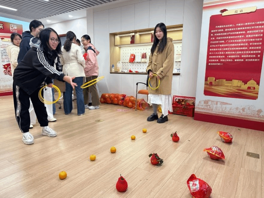 “水果套圈”活动将柚子、橙子、橘子层层叠放,同学们凝神瞄准、相互交流技巧,在轻松投掷中尽享欢乐。