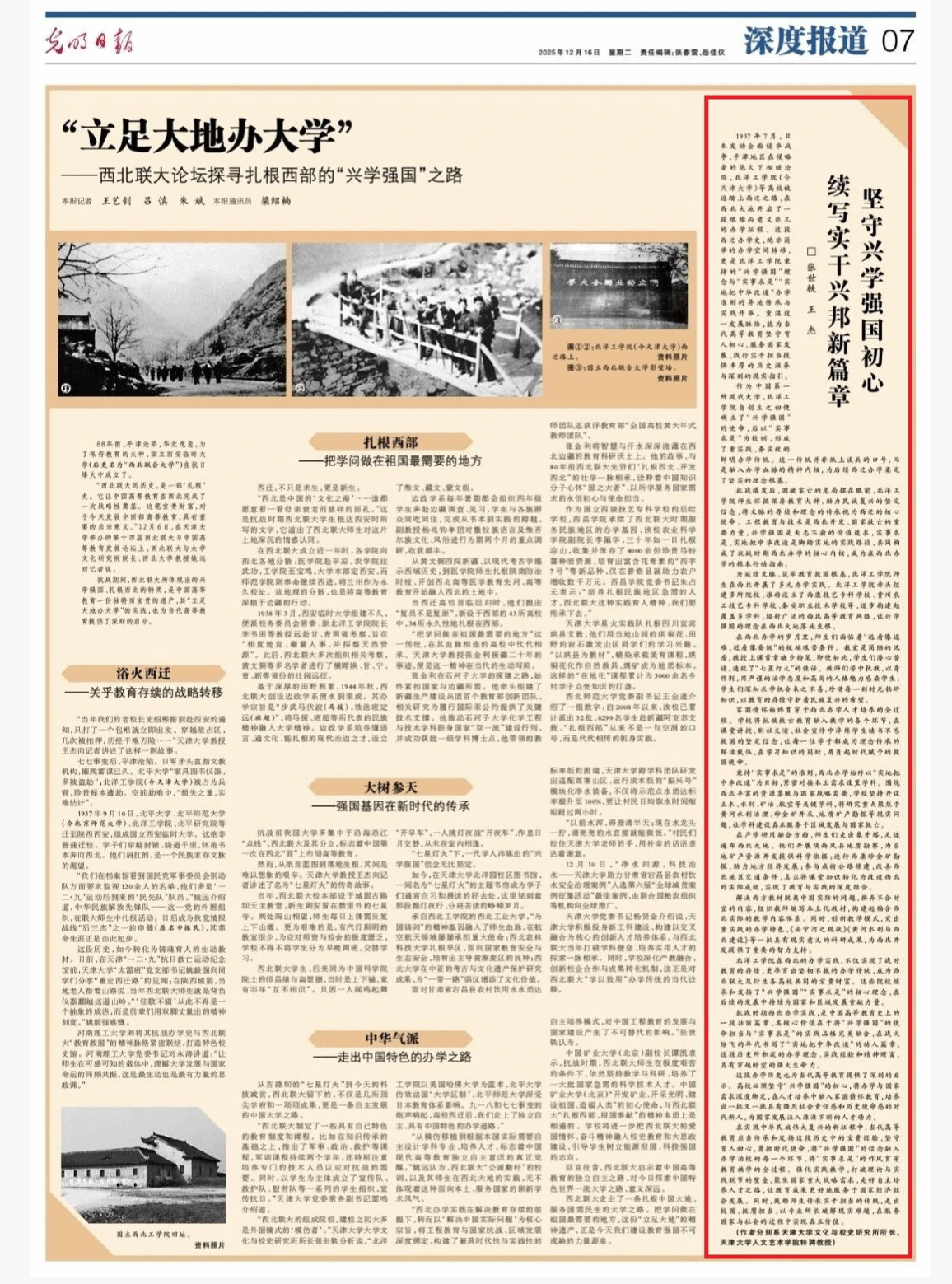近日,我院特聘教授王杰、大学文化与校史研究所所长张世轶在《光明日报》2025年12月16日第07版发表题为《坚守兴学强国初心 续写实干兴邦新篇章》的署名文章。现予以转载,以飨读者。