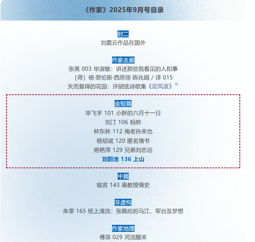 近日,中国当代文学著名杂志《作家》2025年9月号“金短篇”栏目发表小说《上山》,作者是韩国h漫